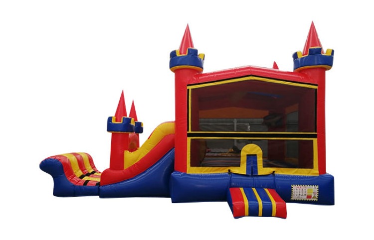 Displaying all of the primary colors, this bounce house is versatile and great for any boy's or girl's party. This unit measures 25'x14' and provides endless entertainment for kids of all ages. Our 25Ft Primary Color Combo is made of flame resistant material, features a safety step up front, rainbow netting, a basketball hoop, a big slide with a safe landing zone and a big bouncing area. One of the most popular bouncy houses, the multi-colored castle has everything you'd want from a basic bouncer. Book now and add one of our Bounce House Rentals take your next party even further!